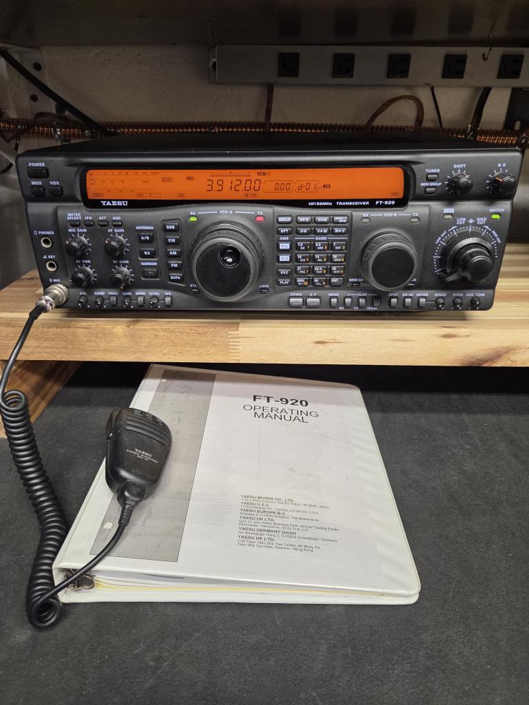 Yaesu FT-920 Transceiver in excellent condition, used daily, not a shelf queen. Full output, reprinted manual, MH-31 hand mic, long fused 12 volt power cord. I will ship in original Yaesu boxes, the original box with the shipping foam for the front and rear, and Yaesu overbox. $500.00 plus shipping to Conus USA only, Paypal is ok or USPS money order, no personal checks or cashiers checks. you can call me at 716 307 5777, or email me at mth408e at gmail.com, no texts please. Thank you Terry good on QRZ.