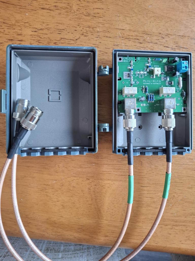I have a 23cm mast mount preamp that was built by the guys in Australia. It comes with the enclosure and a set of cables that have the proper TNC connectors on one end and female N connectors on the other. I installed this unit on my tower. I would get intermittent SWR spikes above 2:1. I contacted the manufacturer. He said the relays sometimes get damaged in shipping and i should send it back to him to be checked out. Shipping to Australia is not cheap, so it is still sitting in my shack 3 or 4 years later. It is surface mount components which I do not have the equipment or skill to work on. I am offering this unit as is for $80.00 including USPS shipping to the lower 48. Payment by cash, or USPS money order. I do not accept any kind of electronic funds transfer. Sale is final, item is sold as is, and no returns or refunds will be accepted.
