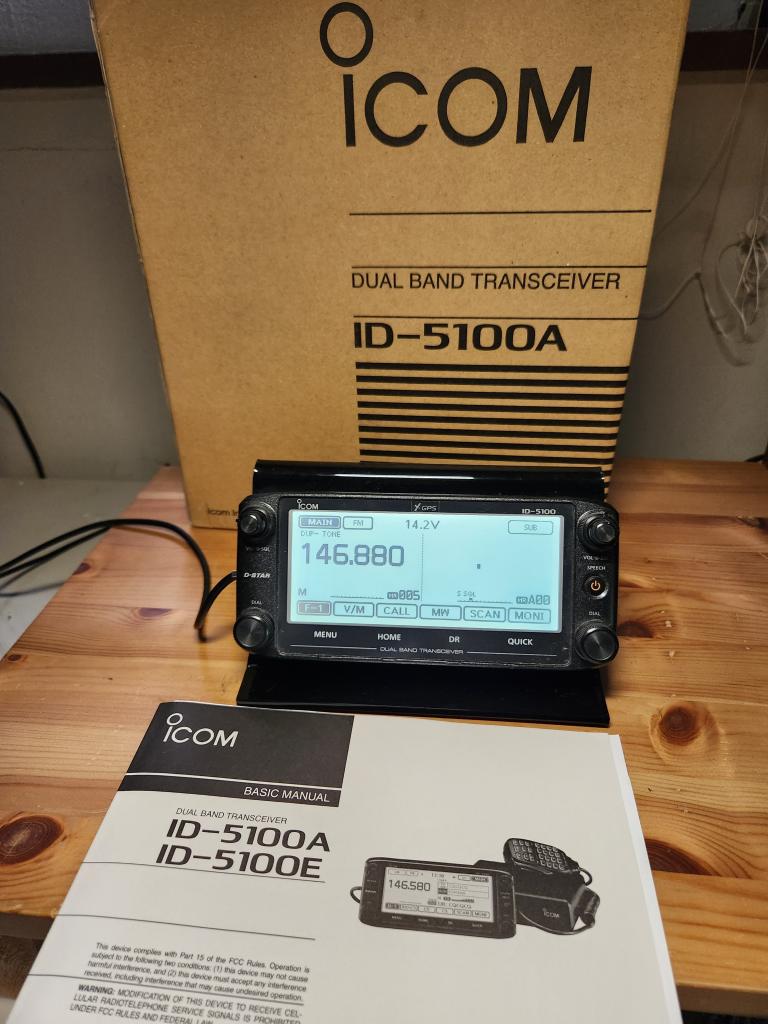 For sale is an exceptionally nice Icim ID-5100A. The Icom ID-5100A is a 50W VHF/UHF dual-band digital transceiver featuring a 5.5-inch touchscreen, built-in GPS, and D-STAR capability. It supports simultaneous DV/DV or DV/FM dual-watch, includes an SD card slot for logging/voice recording, and offers Bluetooth connectivity for app integration. This radio has been sitting on my desktop for several years with very little use. VHF/UHF FM & Dstar activity is very minimal in southern OH. Box, power cable, mounting bracket, manual, etc., included. Also, will throw in the desktop mount that you see in the photo.$400 shipped CONUS.